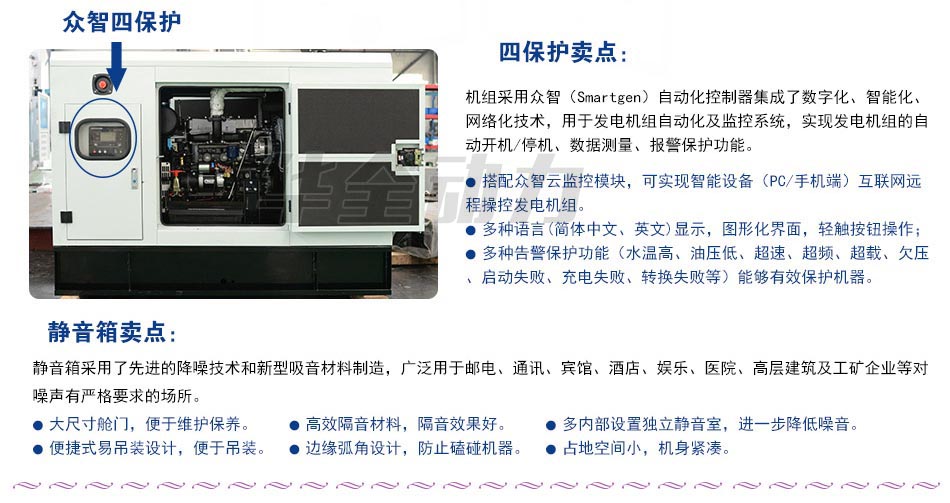 機(jī)組采用眾智(Smartgen)自動(dòng)化控制器集成了數(shù)字化、智能化、網(wǎng)絡(luò)化技術(shù),用于發(fā)電機(jī)組自動(dòng)化及監(jiān)控系統(tǒng),實(shí)現(xiàn)發(fā)電機(jī)組的自動(dòng)開機(jī)/停機(jī)、數(shù)據(jù)測(cè)量、報(bào)警保護(hù)功能。
